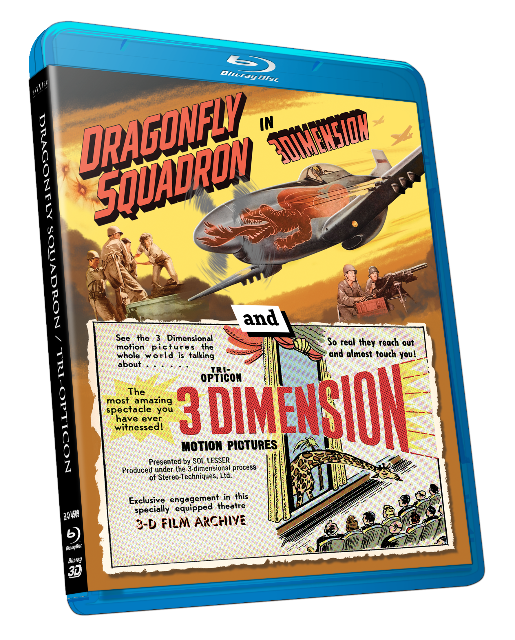 The DRAGONFLY SQUADRON and TRI-OPTICON Blu-ray restorations, as well as the 3-D bonus features, are presented in both Blu-ray digital 3-D (for those with the necessary equipment), compatible anaglyphic 3-D (one set of glasses is included) which will play on any system or monitor, and in standard 2-D as well.